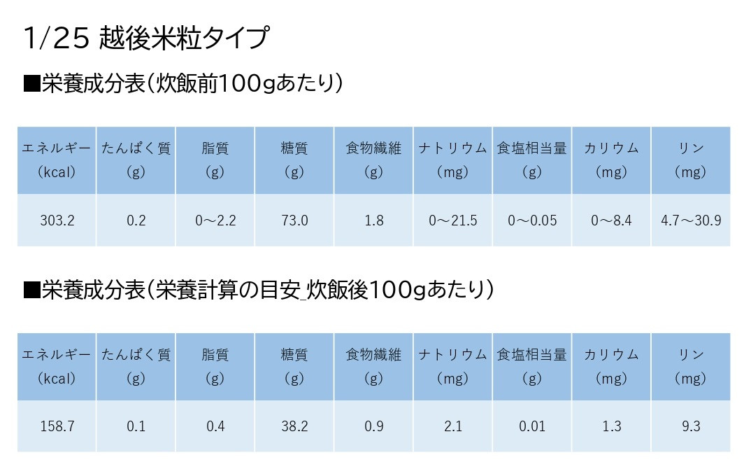 | 容量 | ・たんぱく質調整食品 越後シリーズ 1/25 越後 米粒タイプ 1kg×6袋×6回 |