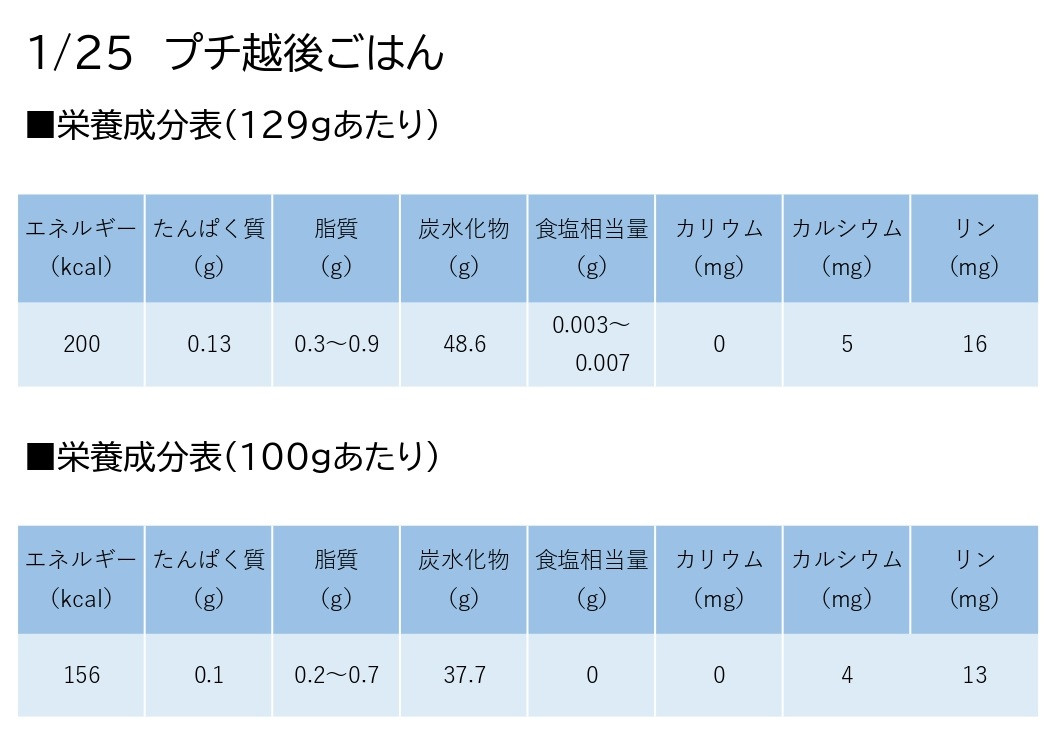 | 容量 | ・低たんぱく質食品 越後シリーズ 1/25 プチ越後ごはん 129g×2×20個×6回 |