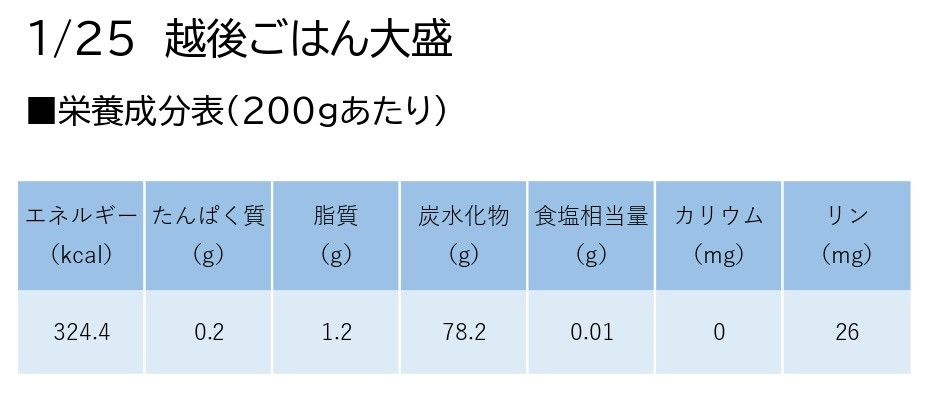 | 容量 | ・たんぱく質調整ごはん 越後シリーズ 1/25 越後ごはん大盛 200g×30個×12回 |