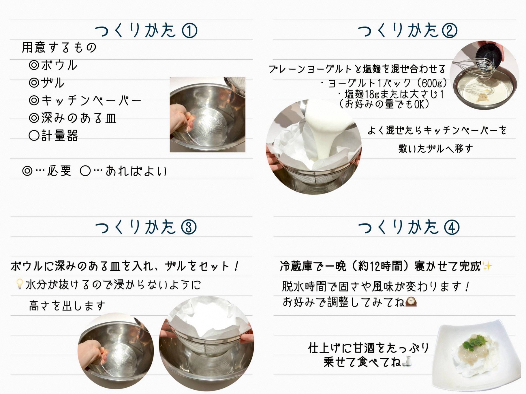 塩糀と生乳100%プレーンヨーグルトを混ぜ合わせ、一晩寝かせて脱水すると