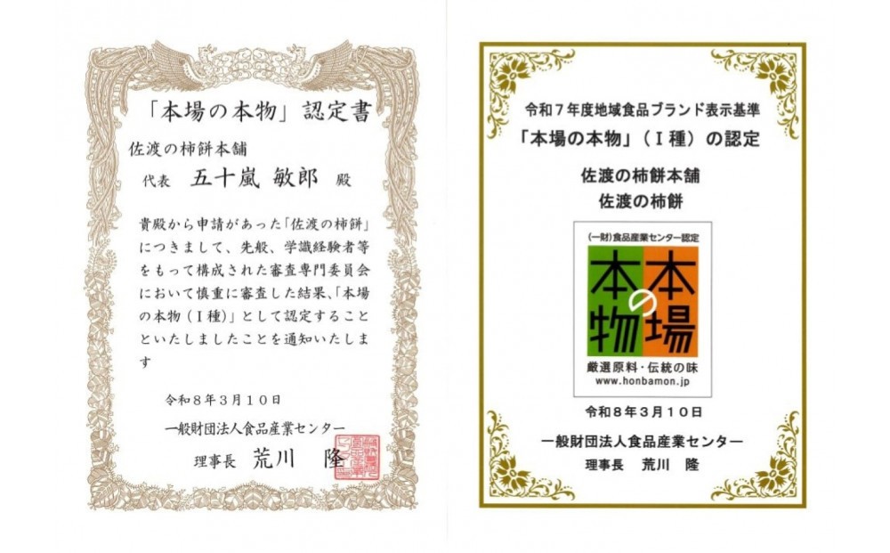 「佐渡の柿餅」と「佐渡の柿餅おかきは、 H26年度、H28年度に『新潟うまいものセレクション会議』で評価を受けた逸品です。 柿餅は、地元の名産、おけさ柿干し柿をお餅に搗き込んだ、佐渡が島限定のお餅です。 柿餅は、佐渡市の赤泊・畑野・南佐渡地域でのみ受け継がれてきた、地域限定の食文化です。 「柿餅おかき」は、柿餅を短冊に切って天日で干し、米油で揚げたカリッカリのおかきです。 柿餅も柿餅おかきも、あと口に干し柿のやさしい甘さを感じます。 懐かしさ溢れる、素朴な味わいを楽しめます。 素にして上質な柿餅と、柿餅のおかきの詰合せです。 令和8年3月10日 一般財団法人食品産業センターから、令和7年度地域食品ブランド表示基準「本場の本物」(1種)の認定を受けました。 「本場の本物」とは・・・ 日本各地の豊かな食文化を守り育てるために設けられた、地域食品ブランドの表示基準のことです。 地域の特色ある農林水産物を使い、伝統的な技術で製造された食品を掘り起こすとともに、品質向上などを目的としています。 本品は、グルテンフリーの製品です。 添加物、アレルギー表示28品目は使用しておりません。 ※画像はイメージです。 ※海上荒天や天候等に伴いフェリーが欠航した場合、お荷物のお届けに遅延等が発生する可能性がございます。 ※保存方法:常温 事業者 :佐渡の柿餅本舗 連絡先 :0259-67-7856