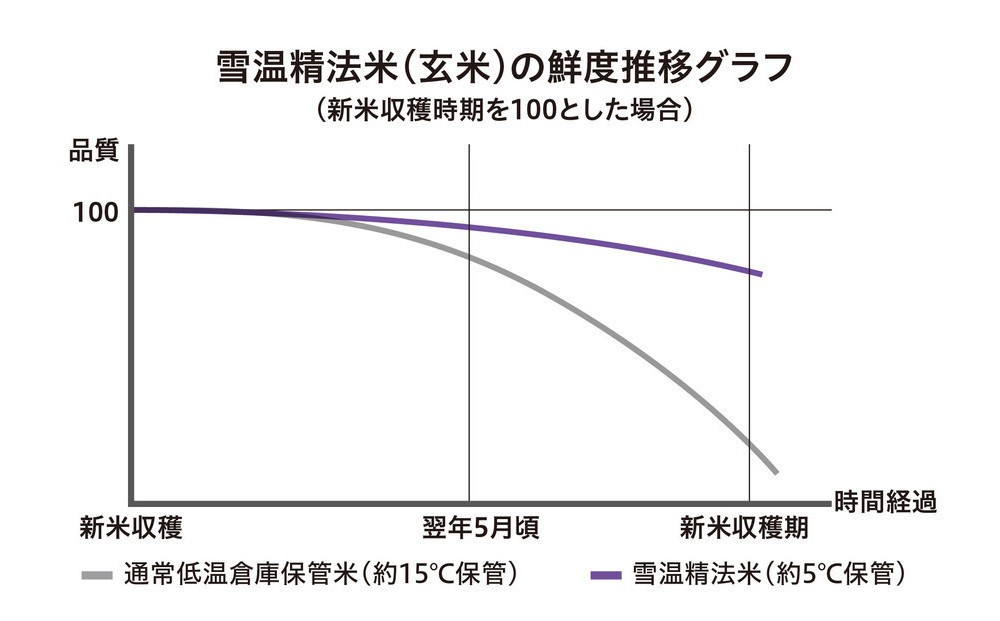 このお米を「雪蔵仕込み」と「雪温精米」をかけ合わせた「雪温精法」で原料保管から精米までを雪の冷気で冷やすことにより、お米の鮮度を保ちます。