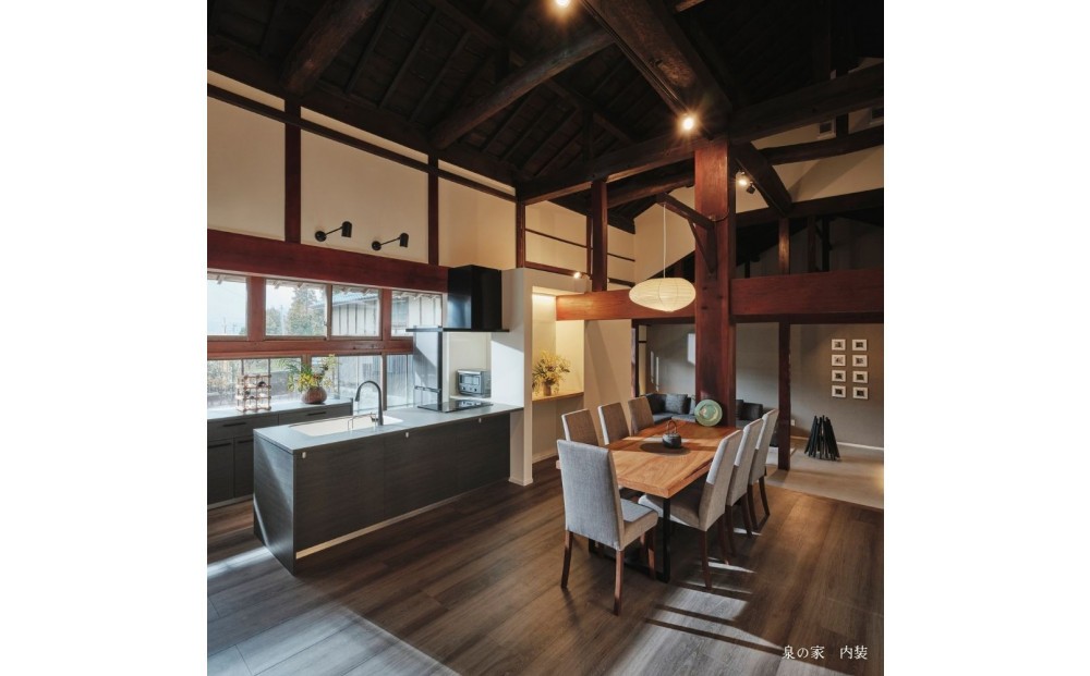 インテリアではもともとの小屋組み架構の梁と大黒柱を活かし、住まう場としての安心感と質の高さを追求。
