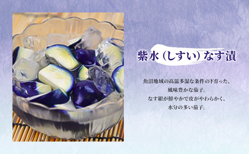 魚沼で生産者が一生懸命に育てた紫水なすを丁寧に漬け込みました。魚沼地方独特の高温多湿な気象条件で育てた旨味が詰まった茄子です。従来の水茄子の皮の柔らかさと色鮮やかな茄子紺が特徴です。なす漬は酸化しやすく、空気に触れますとたちまち変色してしまいますので、お召し上がりの際は液を器に注いで食べやすく切った茄子を入れてご賞味下さい。
