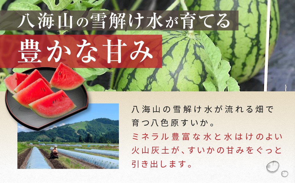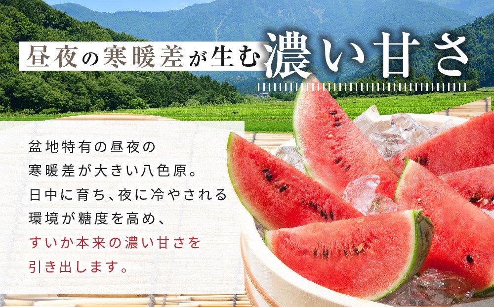 シャリっとした食感と抜群の甘さを誇る八色原(やいろはら)すいか。その栽培地である八海山の裾野に広がる盆地は、水はけの良い火山灰土に、ミネラル成分たっぷりの雪解け水が流れる恵まれた土壌です。さらに昼夜の寒暖差が、糖度を高めて味わいをぎゅっと凝縮してくれます。薄皮で端まで甘味たっぷり、みずみずしくジューシーな味わいにリピーターが多い逸品です。ひんやりと冷やした極上すいかで夏のひとときを満喫してください。