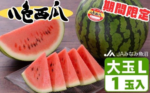 南魚沼の夏の風物詩といえば、この「八色西瓜(やいろすいか)」。 抜群の甘さとシャリ感が楽しめ、多くのリピーターから愛されています。 お礼品は、甘みと食感のバランスが良い完熟品を発送いたします。 八色西瓜は、南魚沼市八色原一帯で栽培されていたことから命名されました。現在は広く栽培され、南魚沼市を代表する特産品の一つとなっております。 南魚沼市は美味しい西瓜ができる条件が整っています。栽培が盛んな八色原は、黒色火山灰(黒ボク土)が広がり、西瓜が好む水はけがよい土壌であることが特徴です。地形も寒暖差の大きい盆地帯。気温が高くなる日中にたっぷり光合成を行い、涼しくなる夜には根をしっかり下して休みます。日本を代表するブランド米「南魚沼産コシヒカリ」と同様に、栽培に適した土壌と盆地特有の寒暖差が、糖分をたっぷりため込んだ美味しい八色西瓜を育みます。 収穫後は、八色西瓜生産組合の自動選果施設にて厳しく選別されます。 光センサーにより、1玉1玉、空洞や糖度がチェックされます。厳しい基準をクリアしたものだけが「八色西瓜」として出荷することができます。 たっぷりサイズの大玉の八色西瓜を、どうぞご家族やご友人らとお楽しみください。 贈答やギフトとしても喜ばれるお礼品です。 ぜひこの機会に、お世話になった方へも一度贈ってみてはいかがでしょうか。 ※画像はイメージです。 ※化粧箱のデザインは変更となる場合があります。 ※令和8年産はLサイズのお届けとなります。 ※発送は7月下旬~8月上旬の期間限定です。 発送日は指定できませんので、この期間にお受け取りできる方のみお申込みください。 ※天候や収穫状況の都合により発送時期が前後する場合がございます。予めご了承ください。 ※完熟品を発送いたしますので、お届け後はなるべくお早めにお召し上がりください。 関連キーワード:フルーツ 果物 くだもの 食品 すいか スイカ 【お問合せ】発送事業者(JAみなみ魚沼 特産センター TEL:0120-808-006)