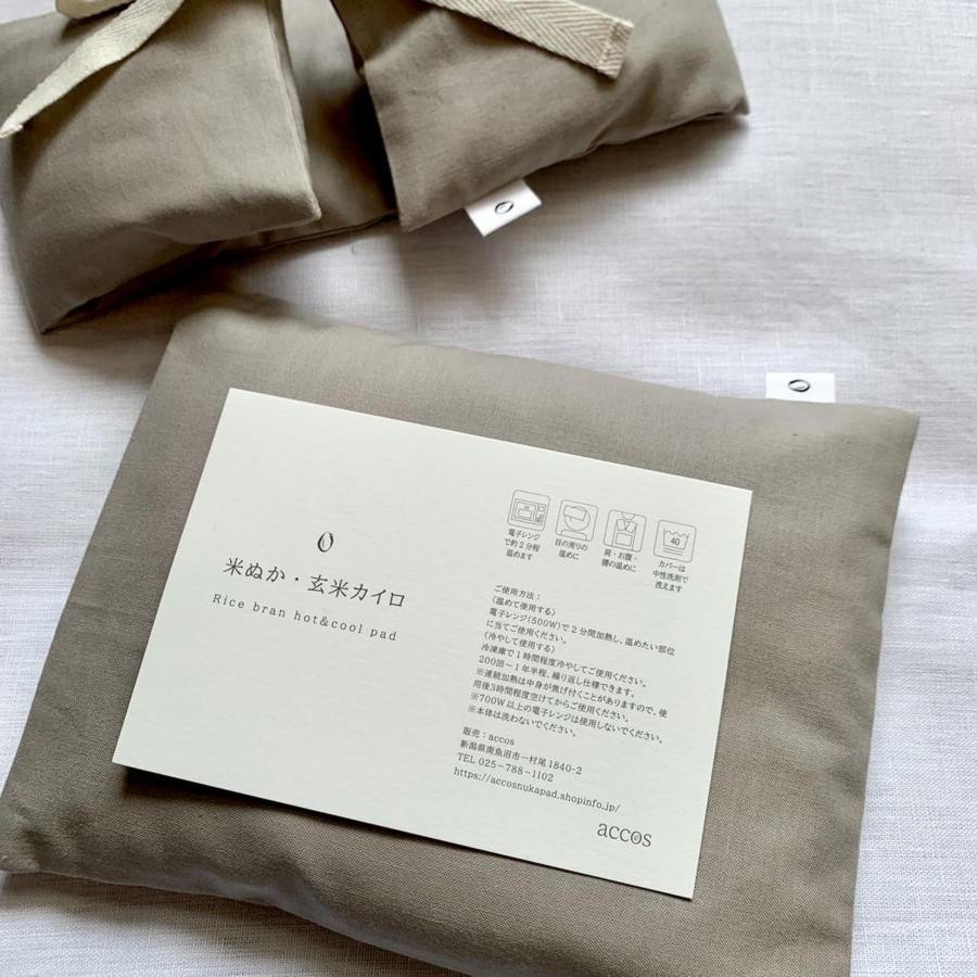 《首肩用》ao×accos 魚沼産コシヒカリで作った米ぬか・玄米カイ…18,000 円 魚沼産コシヒカリの米ぬかと玄米をはじめ、国産のよもぎ、粗塩、ローリエ、唐辛子というこだわりの天然素材がギュッと詰まったaccosのカイロを、柔らかく肌触りのよいaoオリジナル生地のカバーで包んだ極上のカイロです。 ■「accos×ao」米ぬか玄米カイロの3つの特徴 1.新潟県でものづくりを行うブランド同士が、新潟伊勢丹内にある「NIIGATA越品」を通じてコラボが実現。心地よい商品づくりやサステナブルな取り組みなど共通する点が多く、株式会社accosのカイロ本体はそのままにaoのハギレでカバーを作るプロジェクトがスタートしました。 2.用途が無ければ廃棄されてしまう魚沼産コシヒカリの米ぬかや、洋服を作る過程で出るハギレを有効活用。 3.カイロ本体の材料は国産のものを使用し、米ぬかと玄米は放射線セシウム検査をクリアしたものを使用。カバーの生地はJIS規格のホルマリン残留値が乳幼児基準値以下なので、安心且つエコで心地よい素材になっています。 米ぬか玄米カイロ: 電子レンジで約1分間加熱すると約20~30分じんわりとした温かさが持続し、よもぎのほのかに甘い香りが心までほぐしてくれます。 紐で結べるのでズレにくく立ち仕事でも安心です。ギフトにも最適なアイテムです。 ◆ご使用方法 ・《温めるとき》 電子レンジ 500Wで約1分間加熱し、冷え取り、痛みのある個所に当てご使用ください。 ・《冷やすとき》 冷蔵庫または冷凍庫で1時間程度冷やし、熱取りや患部の冷却にご使用ください。 ※カバーは綿100%の天然素材ですので、そのままお皿に乗せても大丈夫です。 ※万が一、電子レンジの中で汚れてしまったり、毎日寝具と一緒でも気持ちよくお使い頂く為にカバーは取り外してお洗濯出来ます。 ◆使用上の注意点!!必ずお読みください!! ・連続使用は発火や焦げ付きの危険性がありますので、冷めても4~5時間程度は開けて、水分が戻るのお待ち頂いてからお使いください。 ・長期使用しない場合は、ジップ付き密閉袋等に入れ、冷蔵庫で保管ください。 【保管方法】 夏季:ジップ付き密封袋等に入れ冷蔵庫で保存してください。 冬季:常温保存 - 常温便