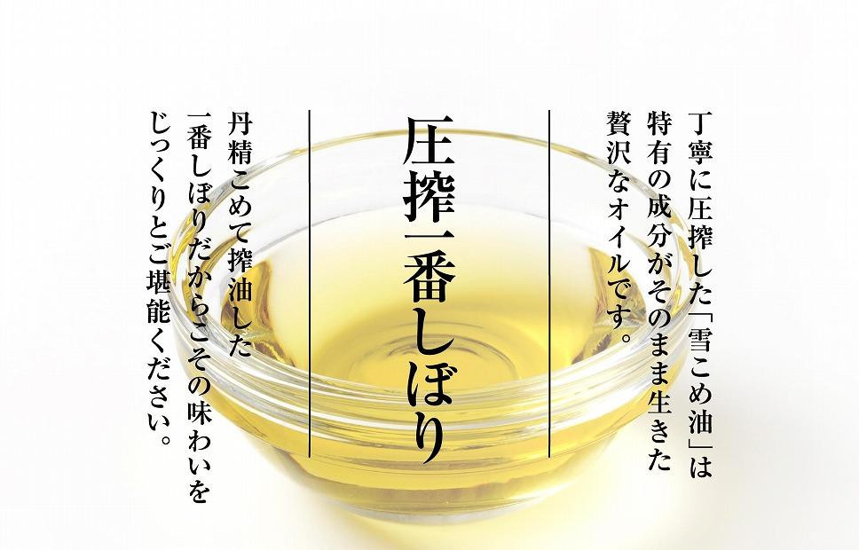 米どころ南魚沼からお届けするこめ油。雪で貯蔵された米から鮮度抜群の米ぬかが出来上がりました。精米後24時間以内に圧搾したこめ油は雑味がなく素材本来の味を引き立てます。加熱調理はもちろんドレッシングなどの生食まで、料理を選ばずご使用いただけます。また、天然の栄養素である『γ‐オリザノール』、『ビタミンE』などの抗酸化成分が豊富なため、からだに優しい逸品です。