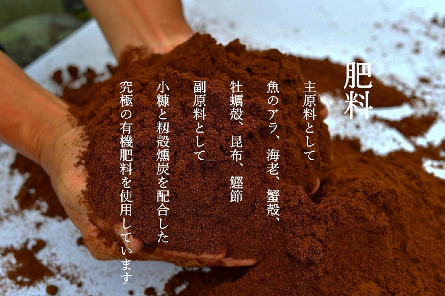 化学肥料は一切使用せずに、魚のアラ・海老・蟹殻・牡蠣殻昆布に小糠と籾殻燻炭を配合した海のミネラル成分たっぶり、究極の有機肥料を使用しています。