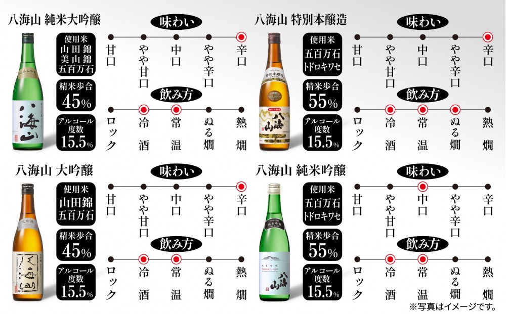 八海山を代表する4種を贅沢に飲み比べをご自宅でお楽しみいただけます。