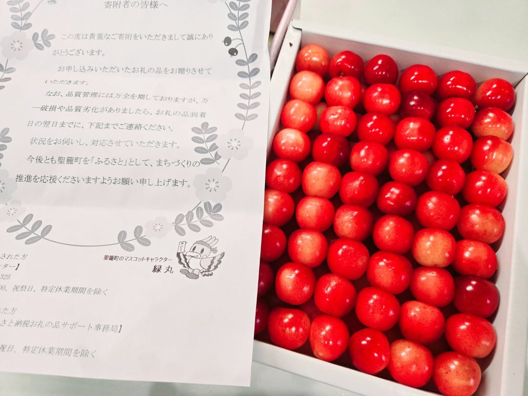 聖籠産のサクランボはあまり流通されていないので、ふるさと納税で手に入るのはうれしいです。とてもおいしいサクランボ。リピートしたいです。
