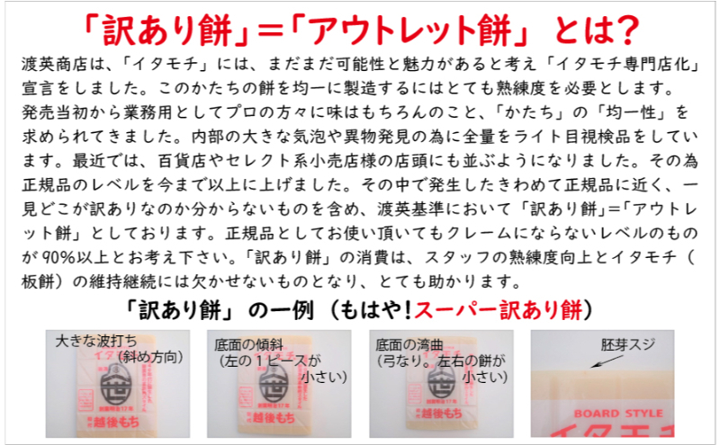 昭和40年代に開発された餅業界の革新的スタイルであるイタモチ(板餅)「初代 越後もち」の訳あり商品になります。弊社の大手シッピングサイト店舗において、毎年販売数で圧倒的NO1を誇る「アウトレット餅」とまったく一緒のものです。伝説の番組スマップステーションで取り上げられて以来、多くのファンの皆様によって支持されている商品になります。訳あり餅と言っても、スーパー訳あり餅と言って過言でない正規品に極めて近い、正規品として販売しても気が付く人はほとんどいないと思われレベルの商品になります。もちろん中身は正規品とまったく一緒です。発生理由は、製造の難しさにあります。板状で、筋目の入ったかたちに成形する為に、人の手で一枚一枚やわらかい状態で型に入れます。その際、平行・直角が少しでもズレると出来上がりで、しわが寄ったり、筋目が並行でなかったり、モヤっとした商品になります。これらが弊社基準では、訳あり餅となります。その他、気泡の混入等があります。熟練度の必要な工程が多いのがこのイタモチ(板餅)製造の特徴で、毎年パートさん等の訓練の為、時には50%以上が訳あり餅になることもあります。スマップステーションで紹介されて以来、完全にその全量をネット販売で消費してもらえるようになりました。渡英商店では、製造の難しさから今では幻の商品となったイタモチ(板餅)の専門店化を宣言し、維持継続、そして発展ができています。年々、製造・販売数もその希少性と懐かしさ、斬新さ、個性を感じる味から伸びております。その分訳あり餅の発生量も増えています。この餅業界のレガシーともいえるイタモチ(板餅)をしっかり守っていく覚悟でおりますので、訳あり餅の消費に、ご協力頂ければ幸いです。今では幻となった、市販のお餅とは、別ジャンルと言えるイタモチ(板餅)をふるさと納税の返礼品として試してみてください。もしも訳あり・アウトレット餅の在庫が無くなった場合は、正規品にて対応致しますので年間通してご安心ください。