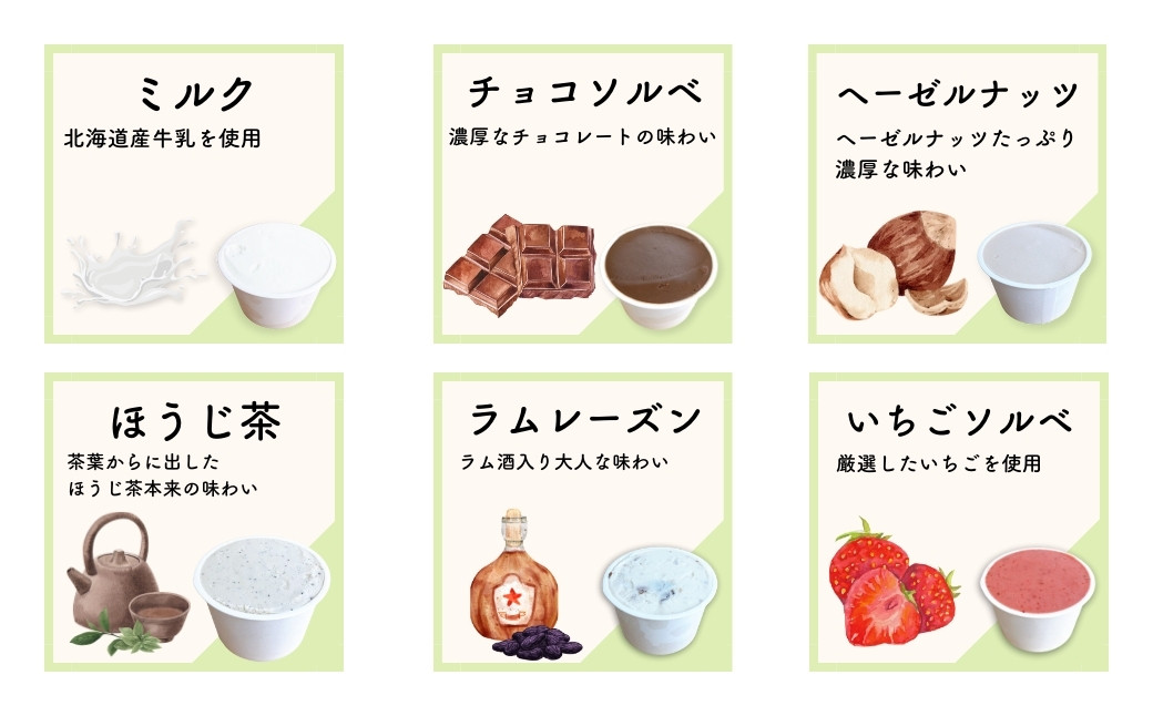 フレーバーはミルク、イチゴソルベ、抹茶、ほうじ茶、アフォガード、ラムレーズン、ヘーゼルナッツ、よもぎあんこ、チョコソルベ、クワトロベリーの10種類と、季節に合わせた店主のおすすめを2種類お届けします。