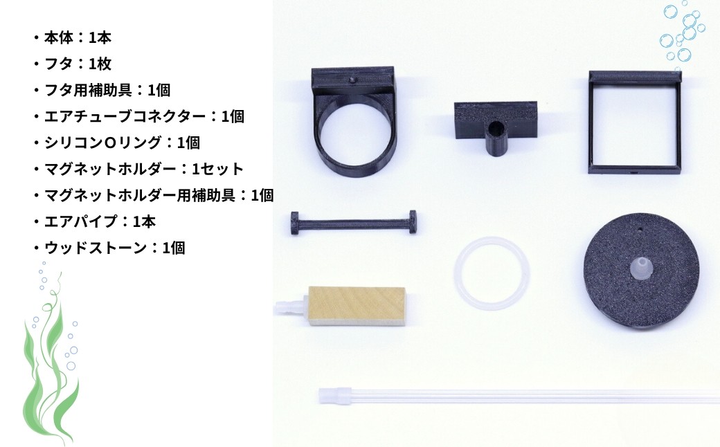 | 容量 | ・本体(ショートタイプ):1本 ・フタ:1枚 ・フタ用補助具:1個 ・エアチューブコネクター:1個 ・シリコンOリング:1個 ・マグネットホルダー:1セット ・マグネットホルダー用補助具:1個 ・エアパイプ:1本 ・ウッドストーン:1個 |