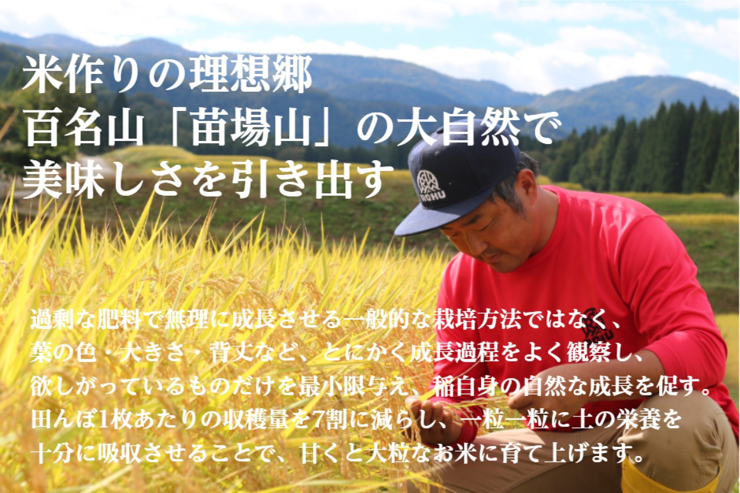 美味しいお米を作るために必要な自然環境を追求し、「天然の肥沃な土」「豊富な天然水」「日夜の寒暖差」の条件を満たす、日本百名山“ 苗場山 ”の山間部にこだわって米作りをしております。 何千年もの年月をかけ蓄積された肥沃な土、至る所で湧き出る良質な天然水、昼は暖かく夜は冷え込む山間部ならではの寒暖差は、上質な甘みを蓄えたお米に成長させてくれます。 また、田んぼ1枚当たりの生産量を通常の30%減らし、稲一本一本に土からの栄養を十分吸収させることで大粒のしっかりとした食感のあるお米に育て上げます。
