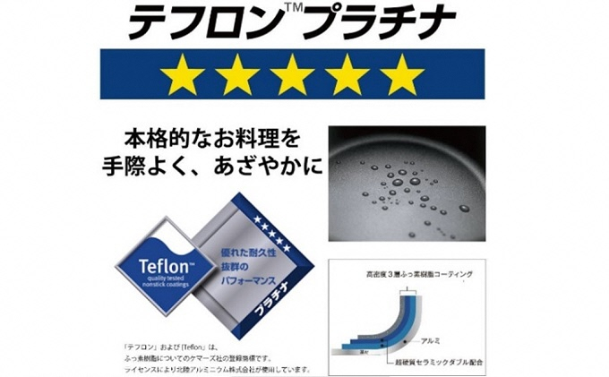◆内面はテフロン(TM)プラチナ加工/調理面のコーティングには、「テフロン(TM)プラチナ加工」を採用。環境によりやさしく、PFOA不使用のテフロン(TM)ブランド。世界中で50年以上使われ続けているふっ素樹脂加工。耐久性に優れ、少ない油でも食材がこびりつきにくく快適に調理が可能。また、表面に食材がくっつきにくいので料理の焼き面が美しく仕上がります。キズや汚れに強く、毎日のお手入れも簡単。