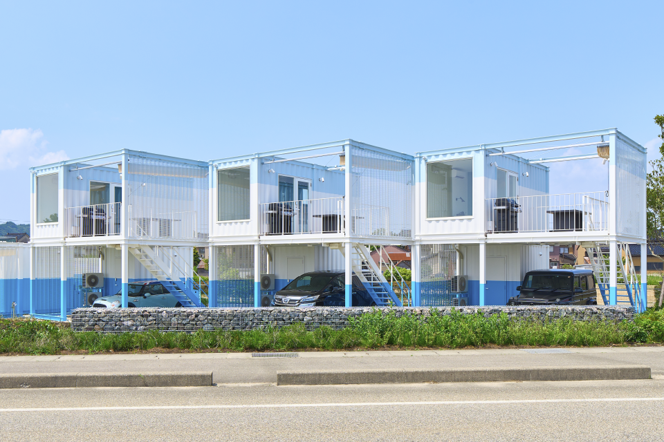 オーシャンスタンダード棟は専用駐車場付きの富山湾を望むテラスを備えた2階建てコンテナヴィラです。