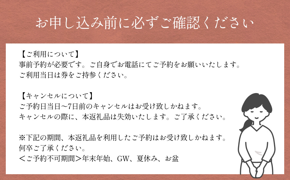 ※こちらは2名様分の利用券になります。(最大4名様まで人数をご追加いただけます。人数追加をご希望される方は、利用日のご予約時にお申し付けください。差額料金をご案内いたします。)