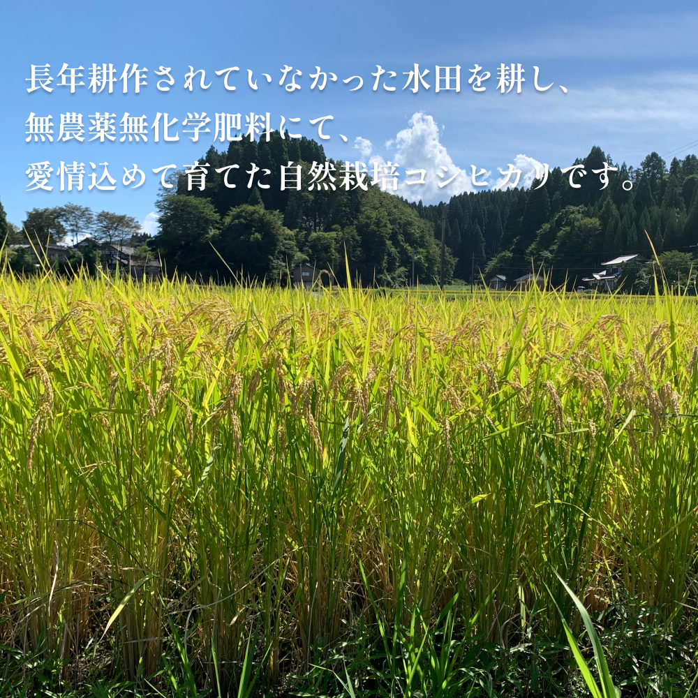 長年耕作されていなかった水田を耕し、栽培中無農薬、化学肥料不使用にて、愛情込めて育てた自然栽培のコシヒカリです。