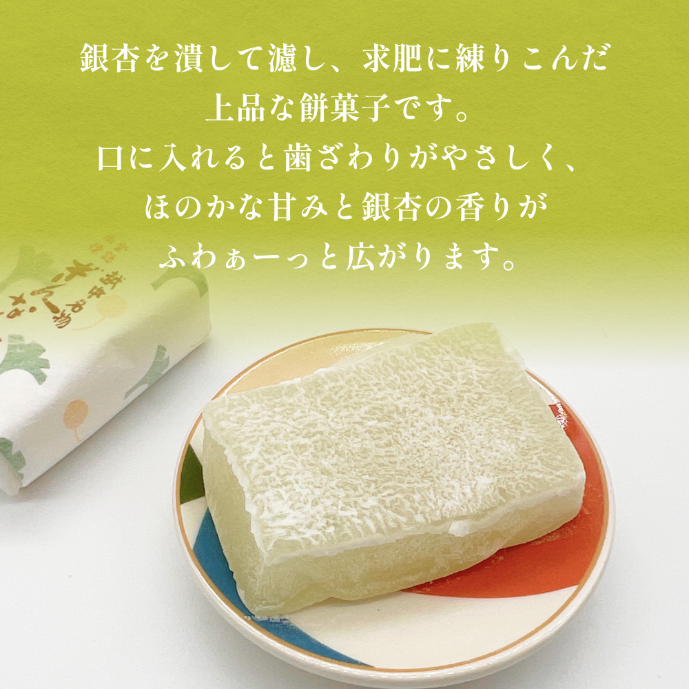銀杏を潰して濾し、求肥に練りこんだ上品な餅菓子です。