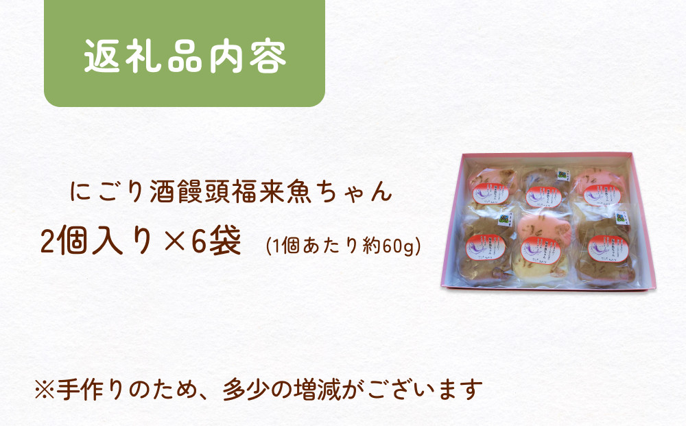 | 容量 | にごり酒饅頭福来魚ちゃん2個入り×6袋 1個あたり約60g(手作りのため、多少の増減がございます) 【原材料】 【紅白福来魚ちゃん】 小麦粉(国内製造)、砂糖、小豆、水飴、どぶろく(米、米麹、その他)、卵白、植物油脂(乳成分を含む)、コーンシロップ、寒天/トレハロース、マルトース、加工でん粉、乳化剤、膨張剤、増粘多糖剤、赤色3号 【ハトムギ福来魚ちゃん】 小麦粉、砂糖、赤生餡、還元水飴、どぶろく、トレハロース、マルトース、はとむぎ、卵白、植物油脂、寒天、澱粉、乳化剤、膨張剤、増粘多糖類、グリセリン (原材料の一部に乳成分を含む) |