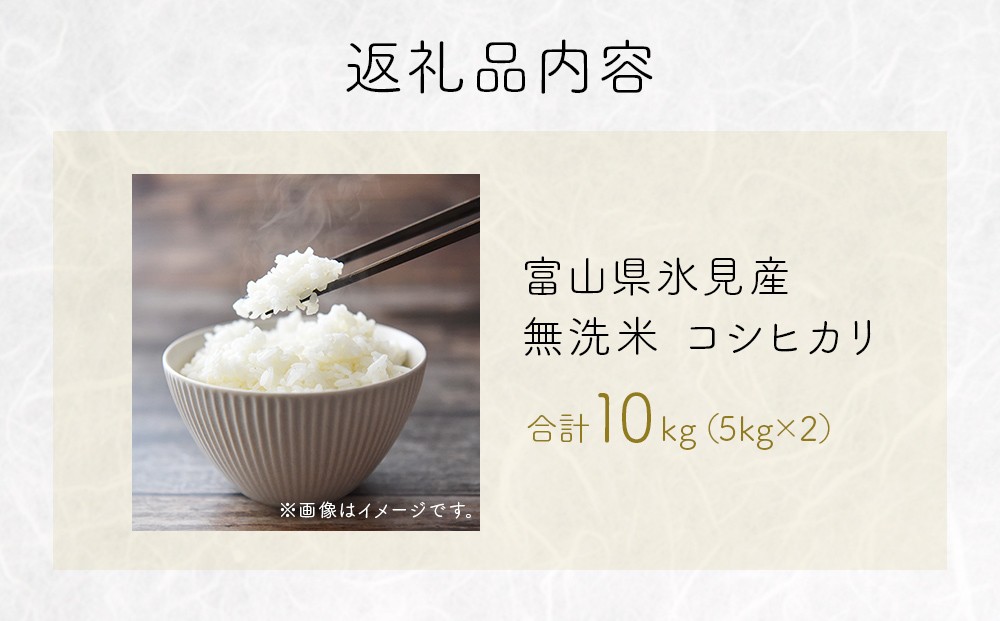 | 容量 | コシヒカリ無洗米 10kg(5kg×2) 【原材料】 氷見産 |