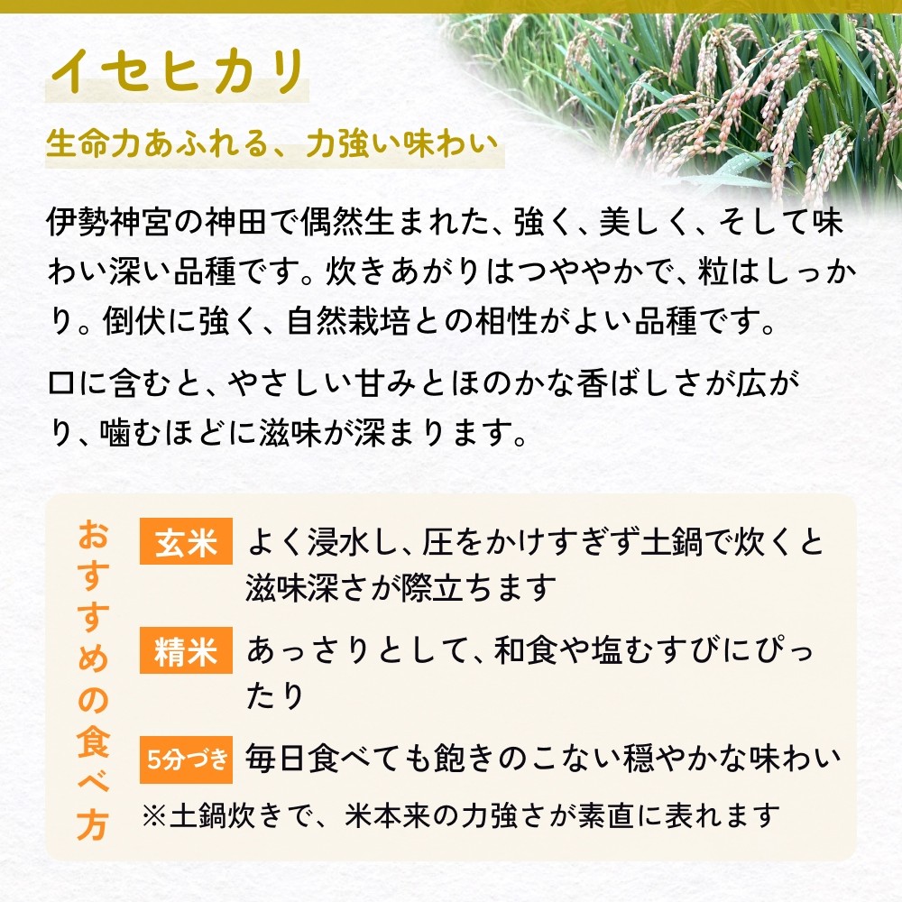 | 容量 | イセヒカリ精米 5kg 【お贈りするお米】 イセヒカリ ー生命力あふれる、力強い味わいー ■品種説明 伊勢神宮の神田で偶然生まれた、強く、美しく、そして味わい深い品種です。炊きあがりはつややかで、粒はしっかり。 倒伏に強く、自然栽培との相性がよい品種です。 口に含むと、やさしい甘みとほのかな香ばしさが広がり、噛むほどに滋味が深まります。 【おすすめの食べ方】 ・玄米:よく浸水し、圧をかけすぎず土鍋で炊くと滋味深さが際立ちます ・白米:あっさりとして、和食や塩むすびにぴったり ・5分づき:毎日食べても飽きのこない、穏やかな味わい ※土鍋炊きで、米本来の力強さが素直に表れます 【土鍋で炊くお米の基本レシピ】 ■材料 ・お米:2合 ・水: ・白米…約400ml ・5分づき…約430ml ・玄米…約500ml ※水はミネラルウォーター・浄水などがオススメです。 ■下準備 ・白米・5分づき:30分浸水 ・玄米:6から8時間浸水(夏は冷蔵庫) ■炊き方 1.土鍋に米と水を入れ、フタをして中火にかける 2.沸騰したら弱火にして10分 3.火を止め、10分蒸らす 4.フタを開け、底から返すようにほぐす 【原材料】 精米(富山県氷見市触坂) |