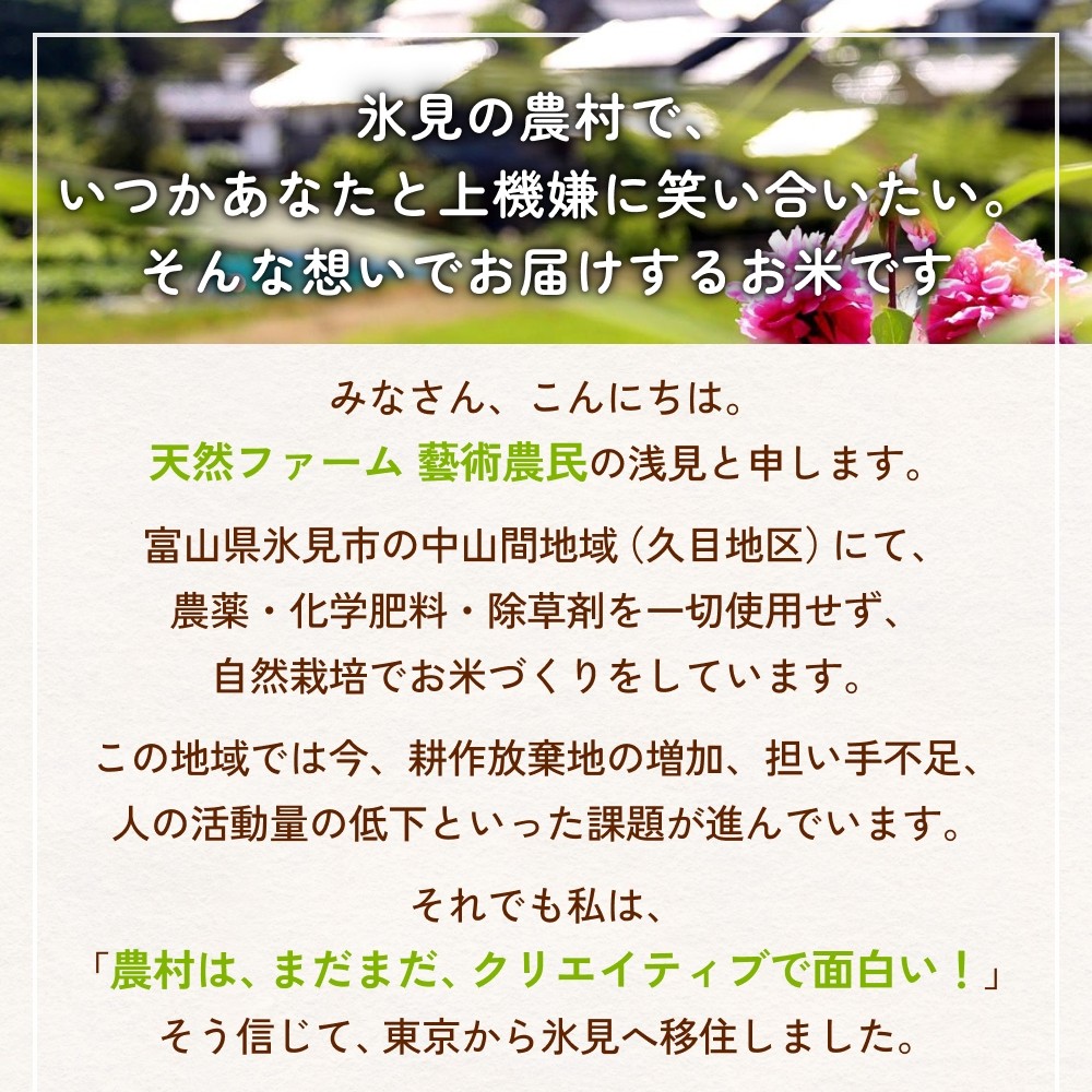 みなさん、こんにちは。『天然ファーム 藝術農民』の浅見と申します。富山県氷見市の中山間地域(久目地区)にて、農薬・化学肥料・除草剤を一切使用せず、自然栽培でお米づくりをしています。