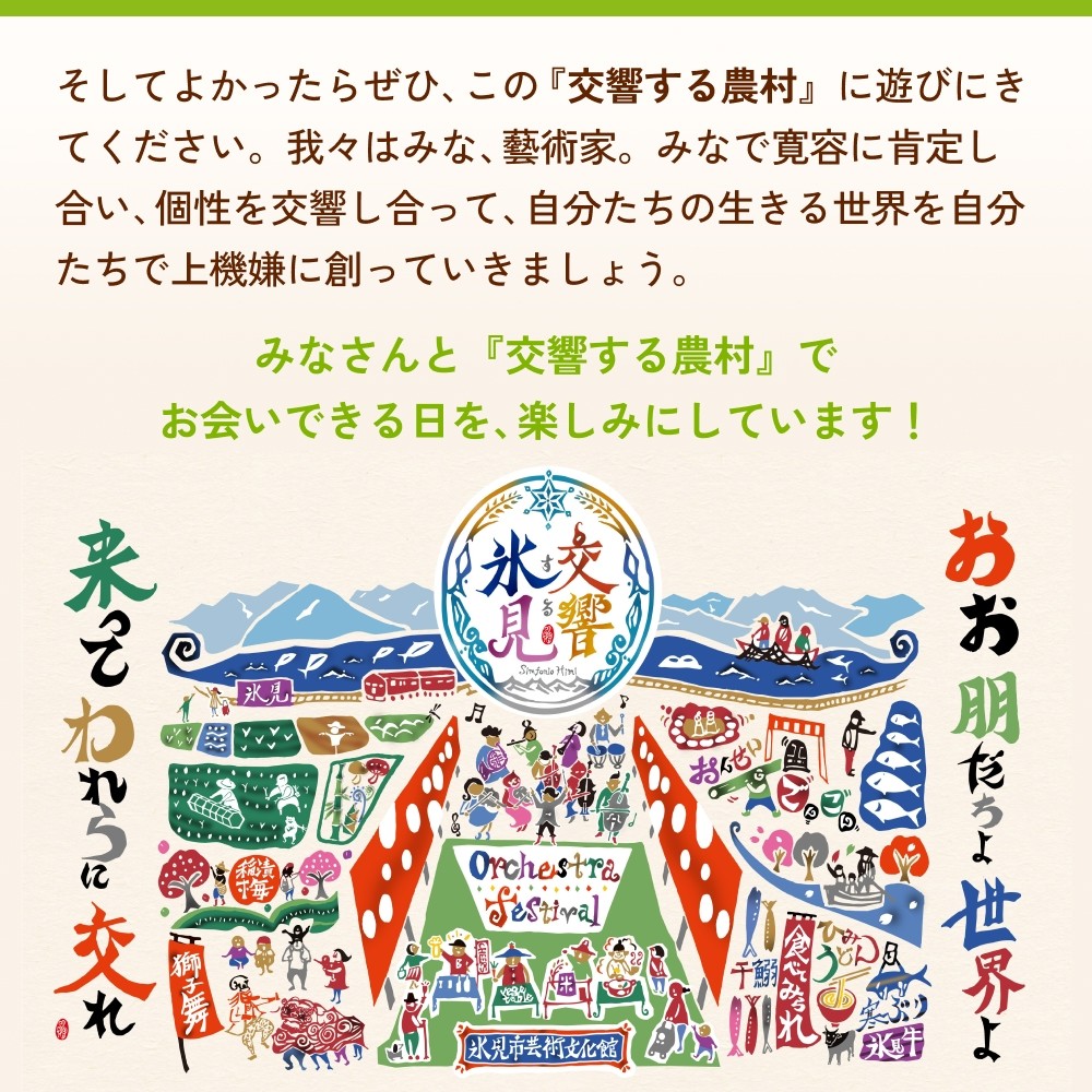 そして、よかったら、ぜひ、この『交響する農村』に遊びにきてください。我々はみな、藝術家。みなで寛容に肯定し合い、個性を交響し合って、自分たちの生きる世界を、自分たちで上機嫌に創っていきましょう。