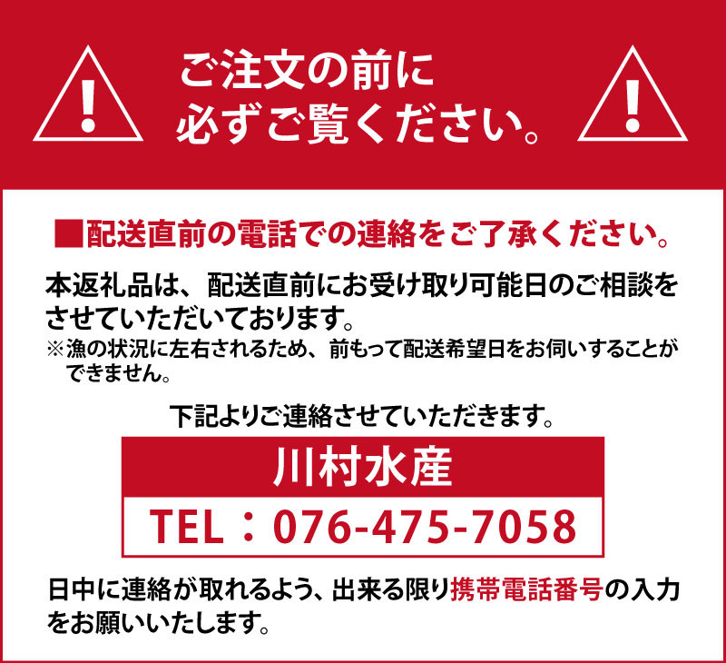 25年9月下旬以降順次発送☆ ※漁の状況により2カ月以上のお時間をいただく場合がございます。 ※お申込み時期によっては、翌シーズンの配送となる場合がございます。何卒ご了承ください。 ※発送前に電話連絡をいたしますので、お申し込みの際は連絡の取れる電話番号をご記入ください。 ※鮮度の良いものを早くお届けしたい為、配送先へ事前連絡させて頂きます。 サプライズ等で申込者へ連絡して欲しい場合は、申込者へ連絡希望と備考へご記載ください。 ※消費期限が短いため、沖縄、離島への発送はできません。ご了承ください。 ※寄附のお申込みの段階では着日希望は承りませんのでご了承ください。 |
