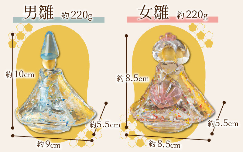 | 容量 | ・ガラスサイズ 男雛 幅×奥行×高さ:約9×5.5×10cm 女雛 幅×奥行×高さ:約8.5×5.5×8.5cm 男雛 約220g 女雛 約220g ・素材 ガラス ・付属品のサイズ 黒台 幅×奥行×高さ:18×12×0.9cm 金屏風 幅×奥行×高さ:22×6×15cm (飾った時の大きさ) |