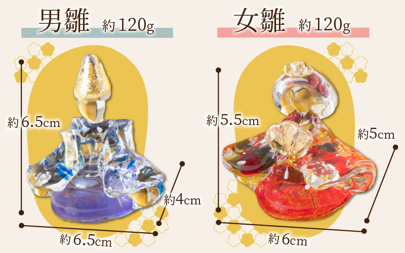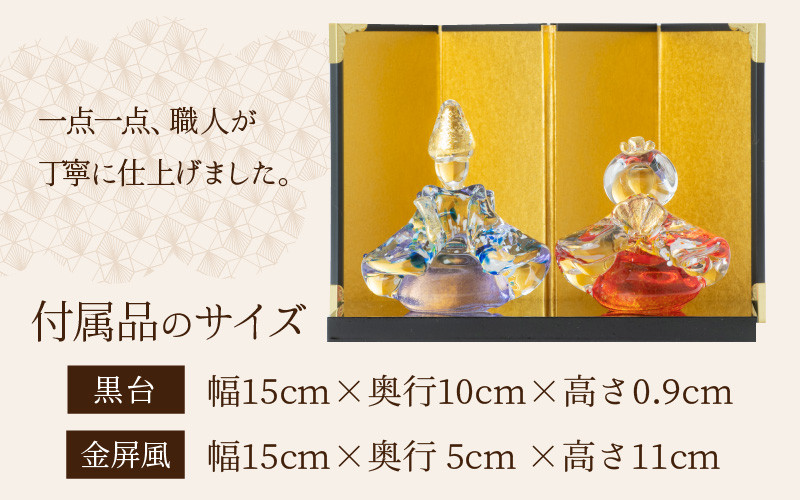 | 容量 | ・ガラスサイズ 男雛 幅×奥行×高さ:約6.5×4×6.5 cm 女雛 幅×奥行×高さ:約6×5×5.5cm 男雛 約120g 女雛 約120g ・素材 ガラス、金箔 ・付属品のサイズ 黒台 幅×奥行×高さ:15×10×0.9cm 金屏風 幅×奥行×高さ:15×5×11cm (飾った時の大きさ) |
