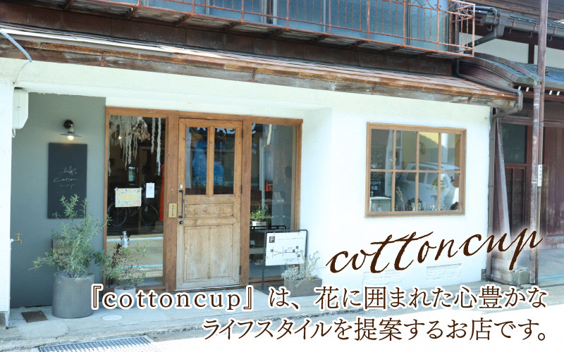 Cottoncupは花に囲まれた心豊かなライフスタイルを提案するお店です。お店は築100年の古い建物の漆塗りの梁や、当時使われていた棚や扉をそのまま使っているため、落ち着いた空間となっており、お花を見てほっとできる落ちついた空間となっています。生花をはじめ、ドライフラワーや小物、穀物を使ったアクセサリーなど多数ご用意しておりますので、是非、お店にも足を運んでいただけたら嬉しいです。