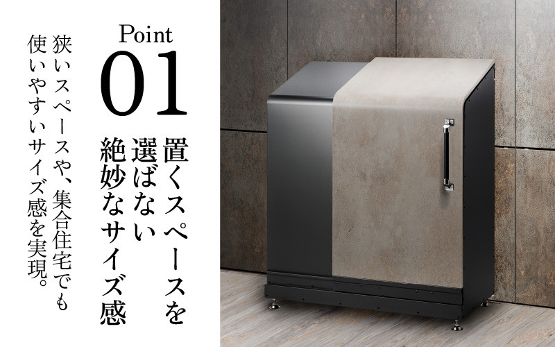 | 容量 | 500L(45Lゴミ袋:11袋) 本体サイズ:W1050×D470×H1220(mm) 扉開口時寸法:W 1320mm (本体、扉含め) 重量:50kg 【原材料】 本体:黒ZAM® 扉:化粧塩ビフィルム |