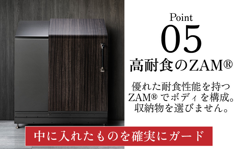 ・本体に使用している黒ZAM®は、高耐食性メッキ鋼板で、赤サビには強いですが、屋外使用の場合は素材の性質上、加工しているコーナーに白サビが発生します。あらかじめご了承ください。使用環境は、屋内、半屋内を推奨しています。