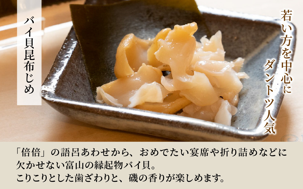 「倍倍」の語呂あわせから、おめでたい宴席や折り詰めなどに欠かせない富山の縁起物バイ貝。