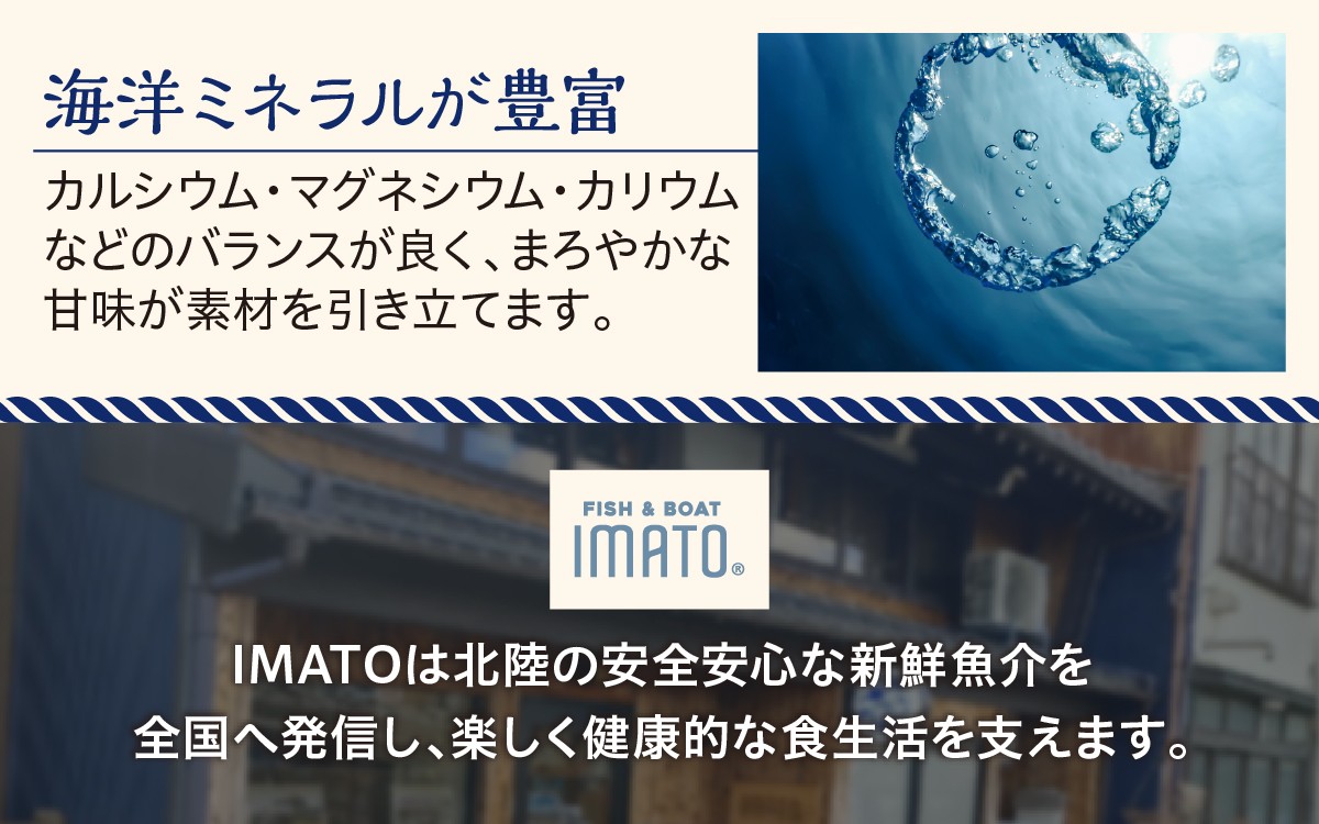 カルシウム・マグネシウム・カリウムなどの海洋ミネラルのバランスがとてもよく、まろやかな甘味が口当たり良いので、いろいろな素材を引き立てる逸品となっております。