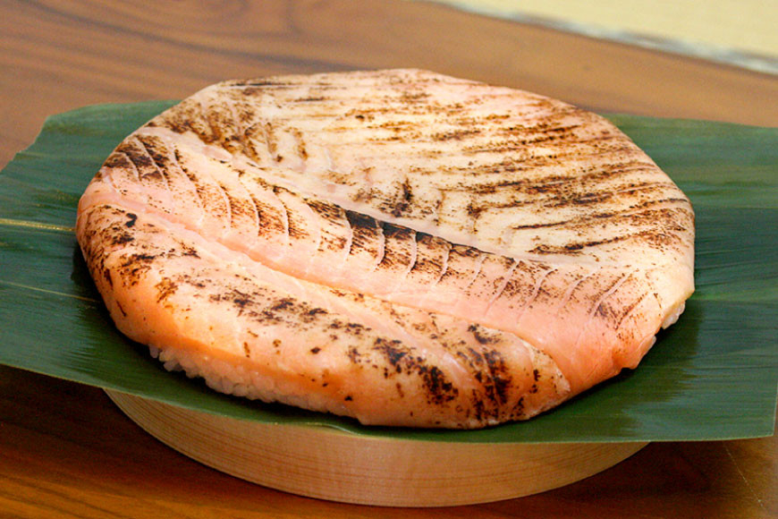 とろける旨味、ノルウェー産極上トロサーモンを使用しています。美味しさと品質、鮮度の良さは、各地のすし店が加盟する「全国すし商生活衛生同業組合連合会」でも、高く評価されています。そのサーモンをさっと強火であぶることにより、ほどよく脂が落ち、甘みが増します。