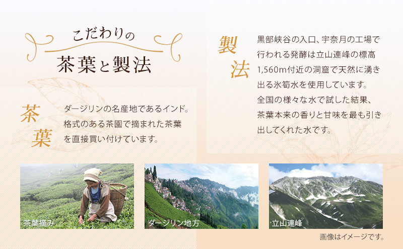 ダージリン茶葉を、秘境黒部の洞窟から湧出する天然水で発酵加工したオリジナルの紅茶です。