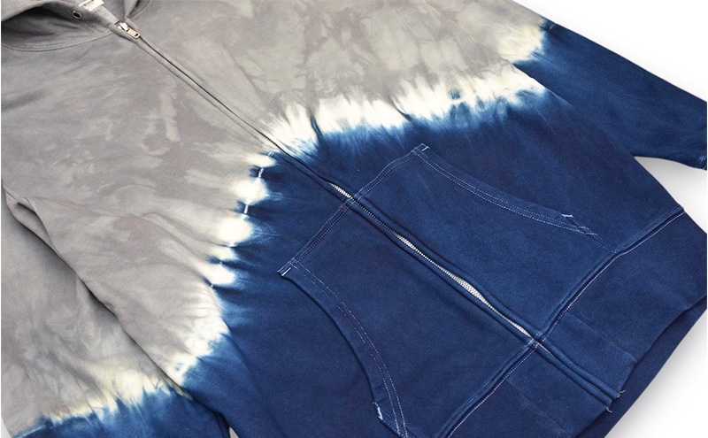 ジップアップパーカーの上部分を一度グレーで染め上げ、 その後下部分は藍染めを丁寧に3回 重ねて染め上げる