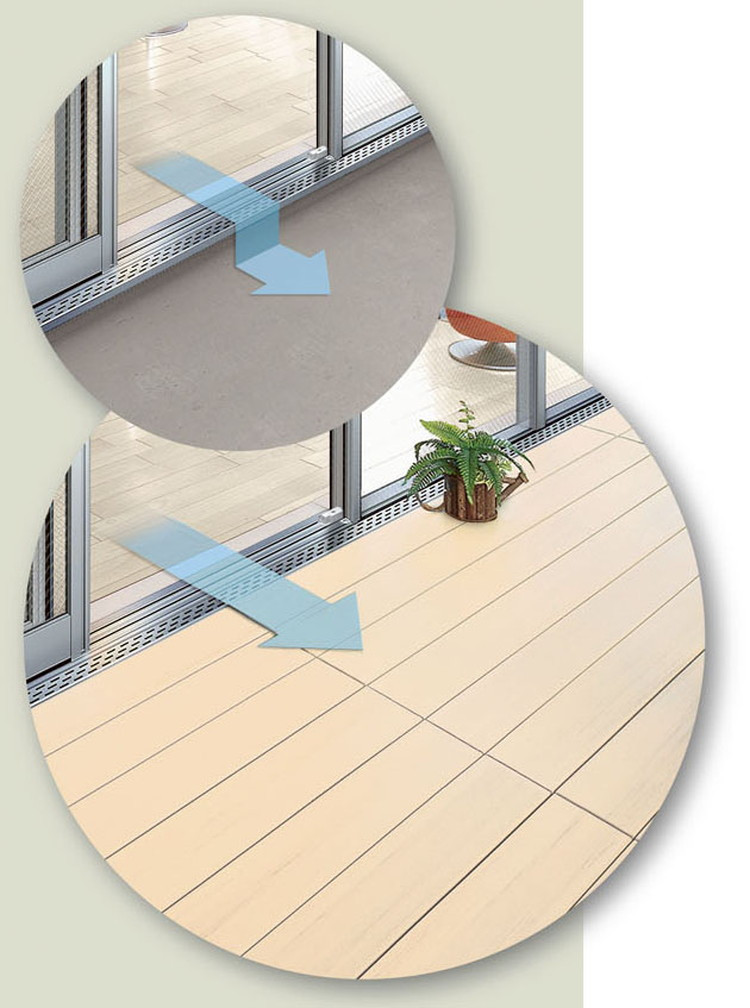 (1)高さが調節できる、人にやさしいユニバーサルタイプの人工樹脂製ウッドデッキ材です。高さ調節ができてお部屋とベランダバルコニーがバリアフリーに!