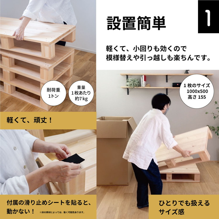 【パレットベッドのこだわりポイント】(1)軽くて、設置簡単(2)国産材・木曽のさわら使用(3)組み替え自在、サイズアップ可能(4)掃除がしやすい(5)隙間に落ちない、です。