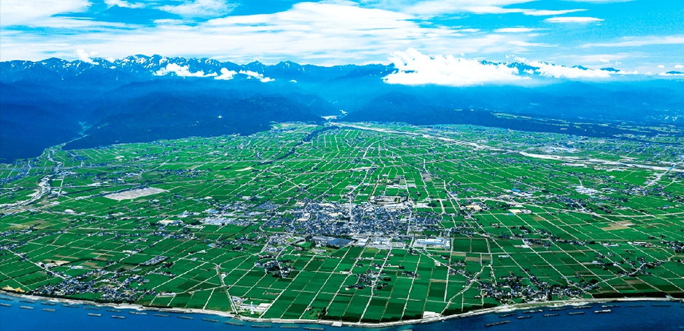入善町は、富山県の北東部にあり、立山と後立山との間を一直線に奔流する一級河川黒部川が形成した我が国の代表的な広く肥えた扇状地・黒部川扇状地の中央に展開する地域です。