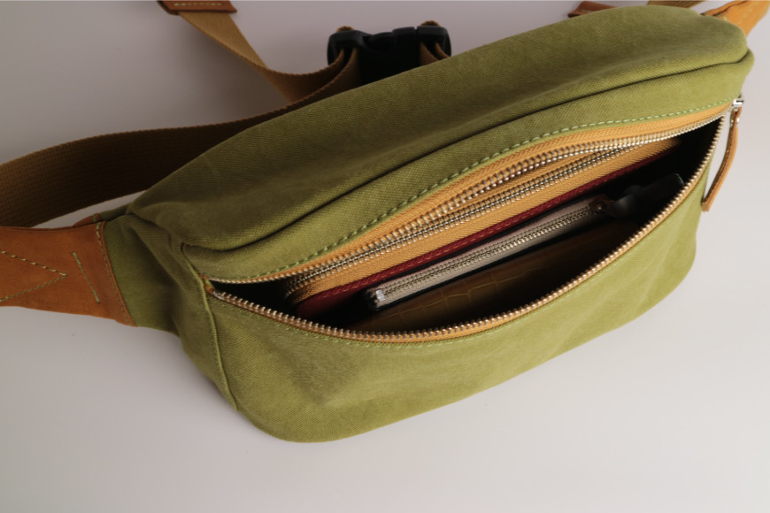 この【ボディバッグ】は、丈夫で実用的な帆布と部分的に使われた高品質の革が特徴です。
