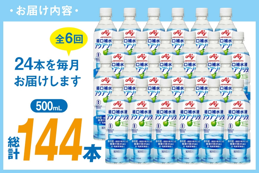 すばやく吸収、しっかりキープ! 定期便 経口補水液 アクアソリタ(R) 500mL 24本入 6回 計 144本 [アールネクスト 富山県 朝日町 34310503] ドリンク 水分補給 スポーツ飲料 スポーツドリンク 熱中症対策 暑さ対策 ペットボトル まとめ買い 味の素