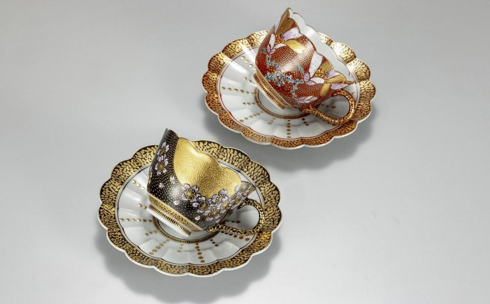 繊細かつ大胆に描かれた九谷焼のペアコーヒーカップです。 九谷焼 ペアコーヒーカップ 金襴手「春光」