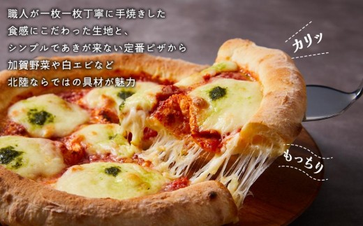 職人が一枚一枚丁寧に手焼きしたもちもちのピザ生地が特徴の冷凍ピザ。 北陸の食材を使用したピザや一番人気のピザを盛り合わせた3枚セット ※市内において、原材料の仕入れから、生地づくり、焼き上げ、梱包までの工程を行うことにより、相応の付加価値が生じているもの