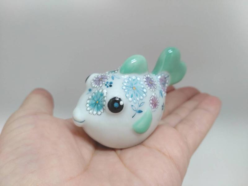 そこに所属する職人が、九谷焼の伝統画風である「花詰」をシンプルにアレンジし、華やかに描いたふぐの置物です。