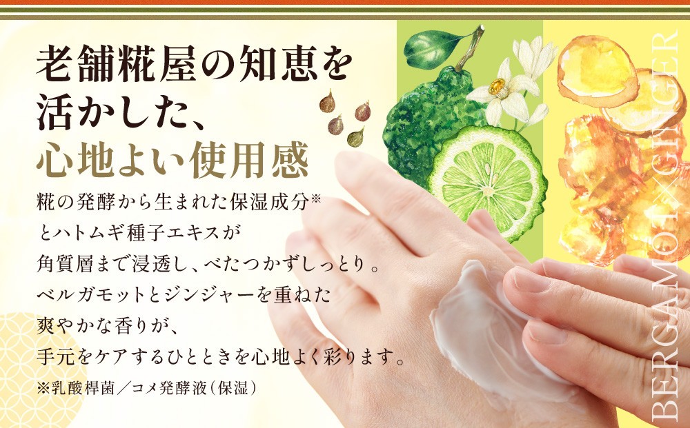 [本品は、ハトムギ・紫黒米・玄米を糀で発酵させ抽出したエキスを使用した糀ハンドクリームです]