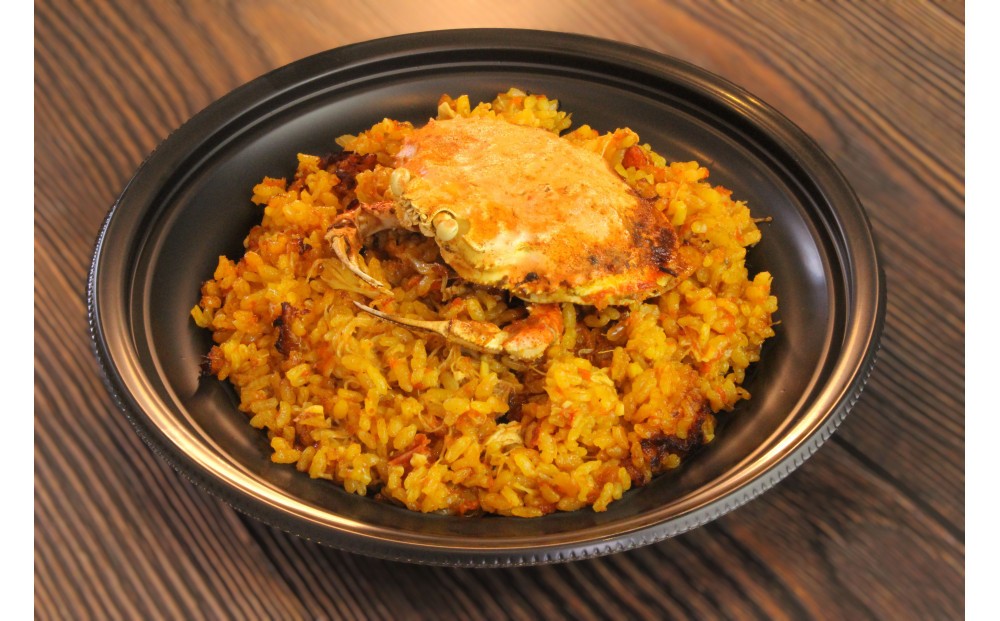 冬の代名詞でもあるカニの中でも、ズワイカニのメスのカニ(香箱カニ)をまるごと1杯使用した贅沢なパエリアです。